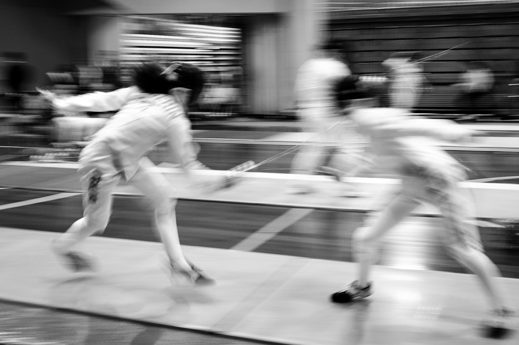 Face your opponent squarely. Tap their blade, touch yours to your forehead, tap blades again. Try to kill each other. Feint, parry, shuffle forward, lunge, thrust, shuffle back, hold that arm stiff!
